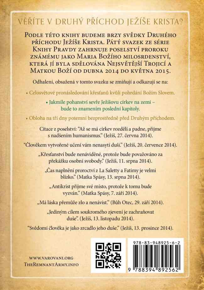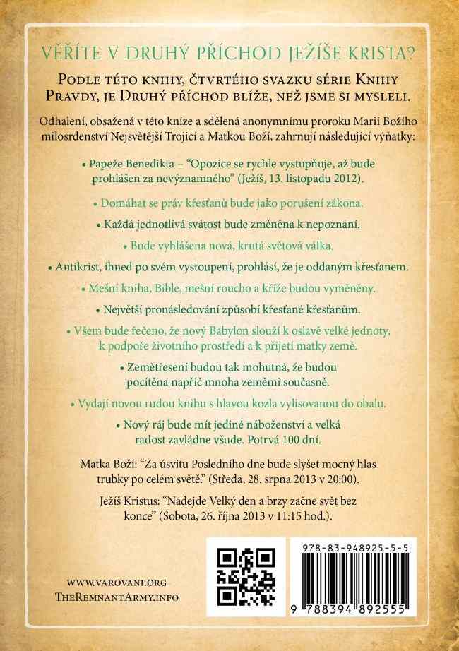 Na závěr ještě pár slov: myslete na své děti a vnuky. V této době ještě nejsou mladí lidé schopni Knihu Pravdy číst, nebo přemýšlet o jejích poselstvích. Doba už ale pokročila a podle sdělení našeho Pána se svět náhle velmi změní. To bude příležitost pro vás, abyste dali Knihu Pravdy jako dar těm, které máte rádi. Nebudou moci přehlédnout jak se proroctví naplňují a po Varování ji snad začnou brát vážně. Nezapomeňte, že každá zachráněná duše se vám přičte k dobru.