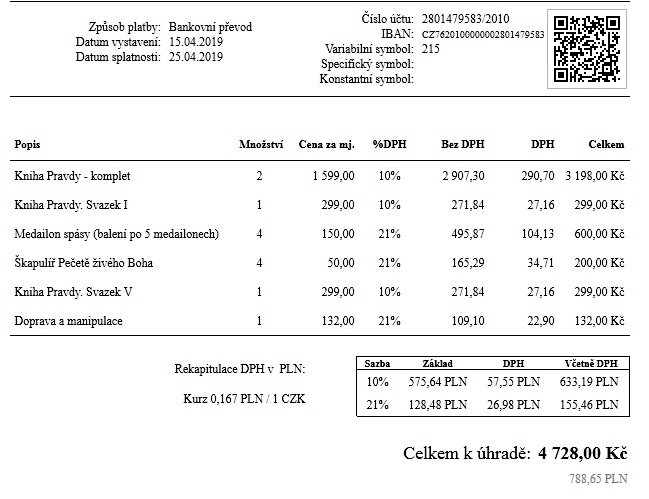 chtěl bych doplnit níže uvedenou informaci z 2. dubna t.r. o ceně objednaných knih, protože mi byla vytýkána negativní reklama. Myslím, že většina z vás pochopila, že cena knih zůstává stejná, tedy 299 Kč za výtisk, ale je-li zaslána českou poštou, pak zaplatíte o 132 Kč víc, protože poštovní poplatek za dodání balíku byl počátkem března t.r. přehnaně zvýšen, což ostatně vyvolalo oprávněnou veřejnou kritiku. Pro ilustraci vám přikládám obrázek části vzorové faktury,